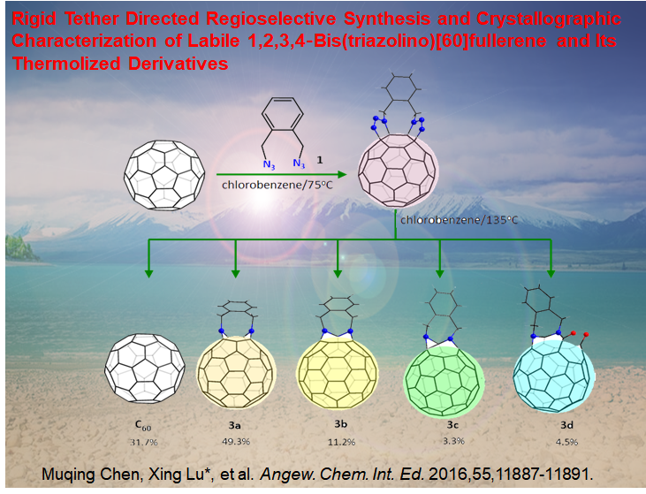 富勒烯是一类全碳球形笼状分子,其大小不到1纳米,是唯一可溶且具有确定分子结构的碳材料。自1985年被发现以来,富勒烯吸引了众多科学家的目光,其主要发现者也因此荣获1996年诺贝尔化学奖。除了具有新奇的结构外,富勒烯分子还具有丰富的物理化学性质.化学修饰是改变空心富勒烯的内在性质和促进其应用的重要手段。富勒烯双加成衍生物在有机太阳能电池中作为受体材料,能更好地提高电池的光电转换效率。然而,富勒烯的双加成反应通常会同时生成大量难以分离的同分异构体。富勒烯与叠氮化合物发生的1,3-偶极环加成反应,异构体较多且难以控制。陈木青采用铰链策略高选择性的合成富勒烯衍生物,并得到进一步热解的所有产物。更重要的是,通过X-射线衍射单晶技术精确地解析了所有产物的分子结构,进而提出一个准确的热解机理。该工作由陈木青博士为第一作者完成,发表在文章《Rigid Tether Directed Regioselective Synthesis and Crystallographic Characterization of Labile 1,2,3,4‐Bis(triazolino)[60]fullerene and Its Thermolized Derivatives》,被德国应用化学《Angew. Chem. Int. Ed.》杂志接受发表。