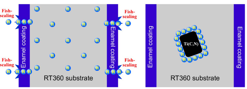 含Ti系微合金热轧搪瓷钢RT360是一种Fe-C-Mn-Ti成分体系析出强化的热轧低合金钢,它主要被用于作为核电站热交换器搪瓷散热片的原料基板。通过一定的烧搪温度进行熔合并密着在RT360上的搪瓷层复合基板已经被最为一种低成本、低能耗环境友好型材料用于替代其他的耐腐蚀合金用于核电站散热片的制造。本项目研究了烧搪温度对含Ti系微合金热轧搪瓷钢RT360表面搪瓷层的微观组织和性能的影响,结果表明当烧搪温度为850°C时,RT360中Ti(C,N)颗粒的密度由于析出和固溶的相互作用而最大化。最大化的析出密度导致了氢陷阱数量的最大化,这为搪瓷层提供了最好的抗鳞爆性能。一旦烧搪温度超过850°C,由于Marangoni效应导致了足够多的钢-瓷界面富Fe的锚点,从而获得了较好的密着瓷层。但是,当烧搪温度900°C时,熔融搪瓷粉的过度流动性导致了搪瓷层厚度不均。总之,850°C烧搪能显著改善散热片上的搪瓷层质量。